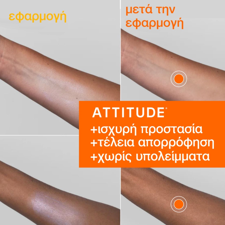 Τα αντηλιακά ATTITUDE με βάση ανόργανες ενώσεις δεν έχουν νανοσωματίδια (non-nano) και έχουν τη μορφή συμπαγούς κρέμας (στικ) για άνετη αλλά και ελεγχόμενη εφαρμογή. Δημιουργούν μια φυσική μεμβράνη προστασίας στην επιδερμίδα, μια ασπίδα ενάντια στην ακτινοβολία UVA και UVB (ευρύ φάσμα) με δείκτη προστασίας SPF 30.