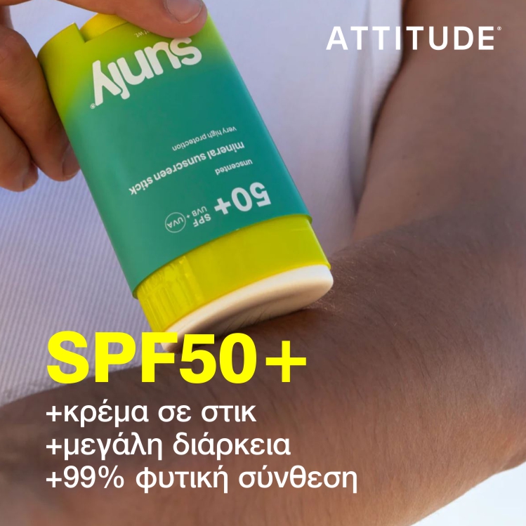 Το πιο ισχυρό φυτικό αντηλιακό – χωρίς υπερβολές. Η σειρά ATTITUDE έχει μια καινοτόμο σύνθεση σε μορφή στικ-κρέμας, που γλιστράει απαλά στο δέρμα για να προσφέρει εξαιρετική αντηλιακή προστασία με εύκολο και απόλυτα οικονομικό τρόπο.